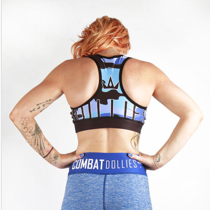 Combat Dollies Blue Camo sports bra is made from strong polyamide and elastane with reinforced stitching and double layered for extra support. Helps keep you dry during your workout. This material is strong and won't go see through.