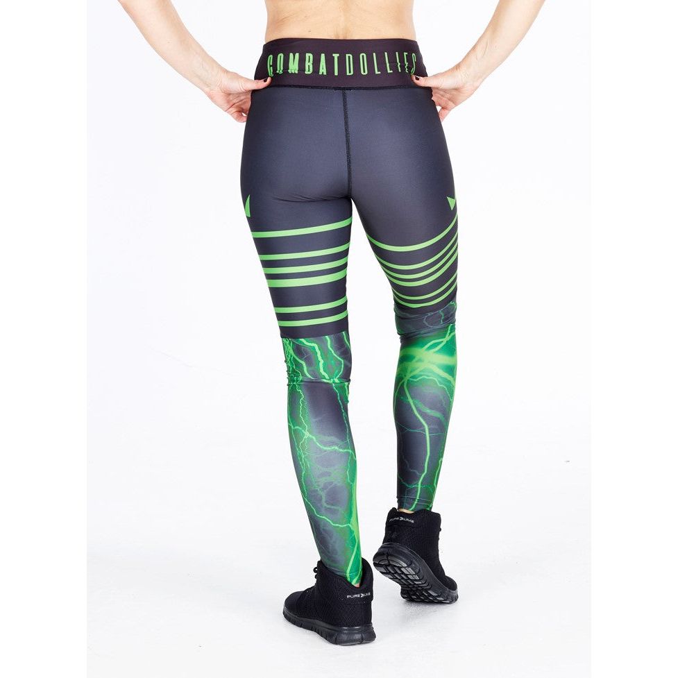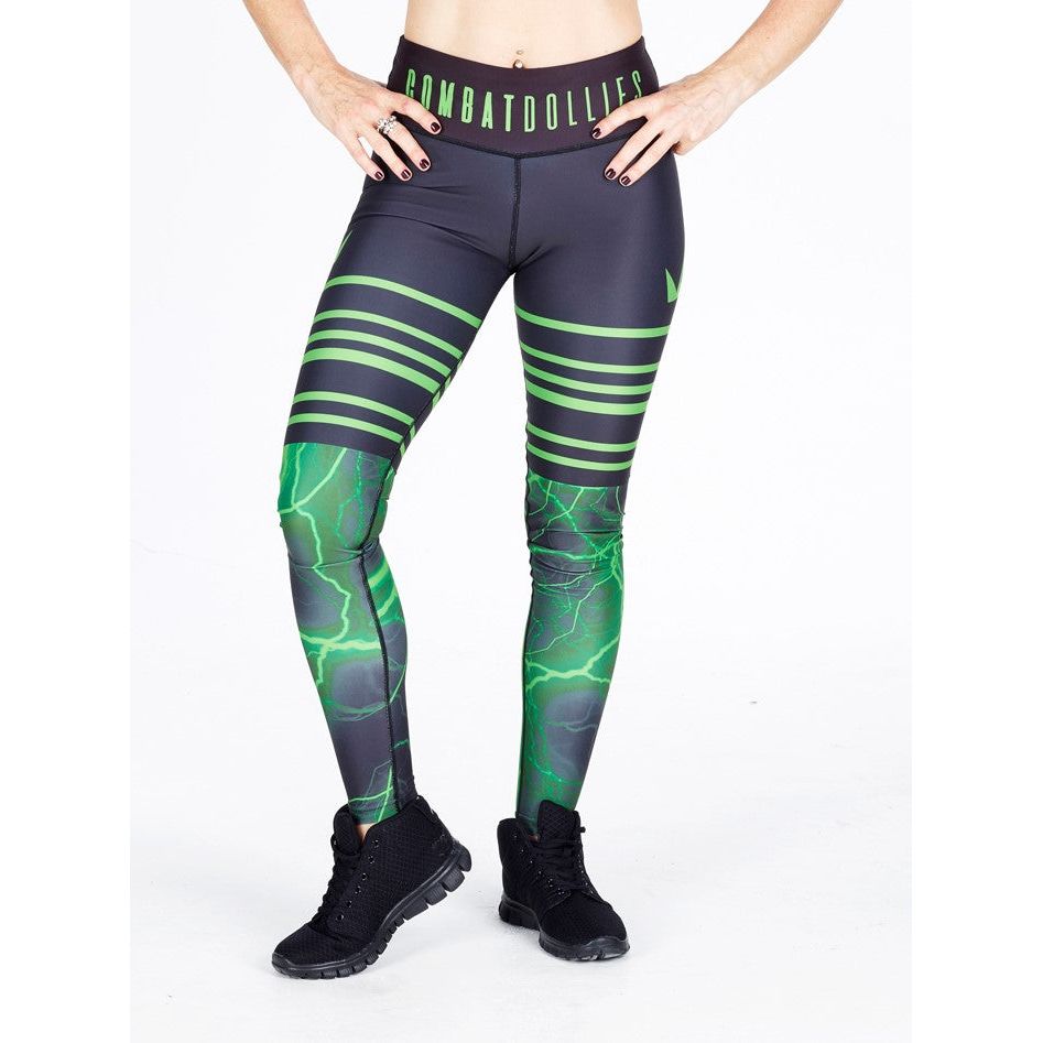 Be bold in the Combat Dollies Green Lightning Leggings. Matching Bra available. Combat Dollies Fitness Leggings designed for extreme comfort. The material has sublimation printing that will not peel, crack and is completely squat proof! Extremely comfortable and durable fabric