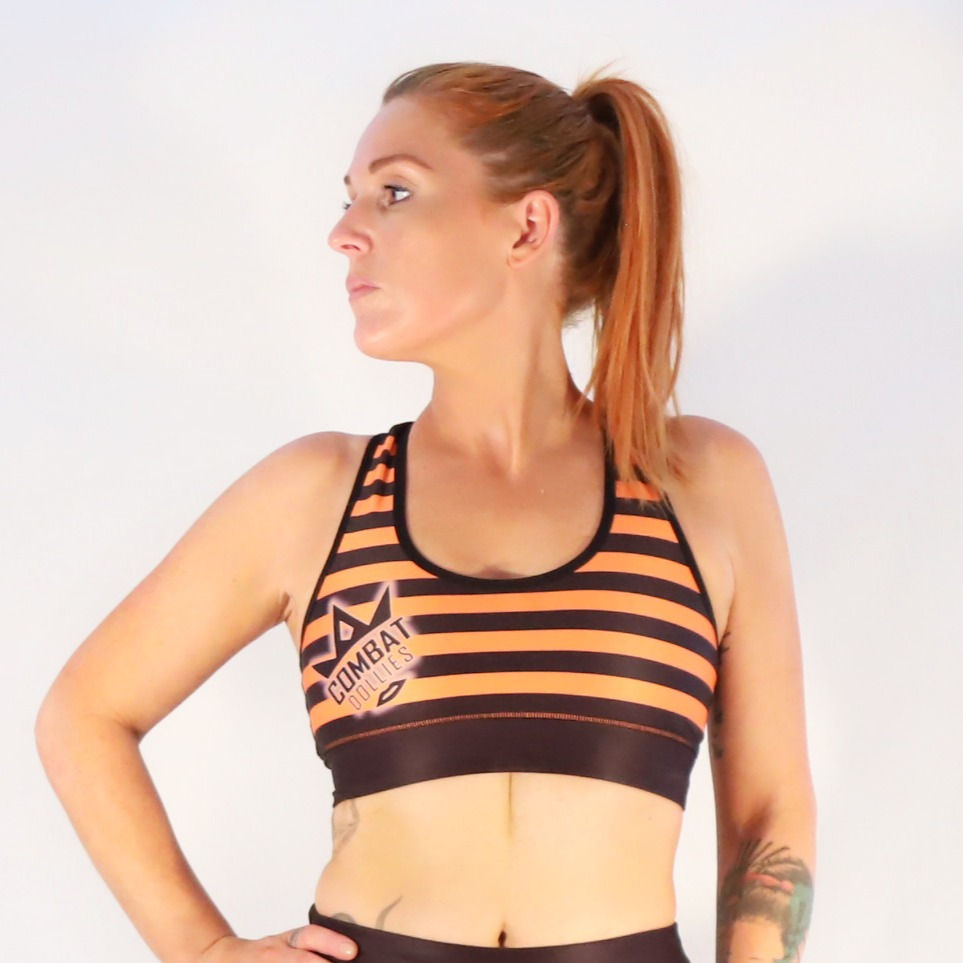 . Limited edition haunted house sports bra. . Black and orange stripes cover the front and a wicked pumpkin haunts the back. . Double layered for extra support. . Matching leggings available.