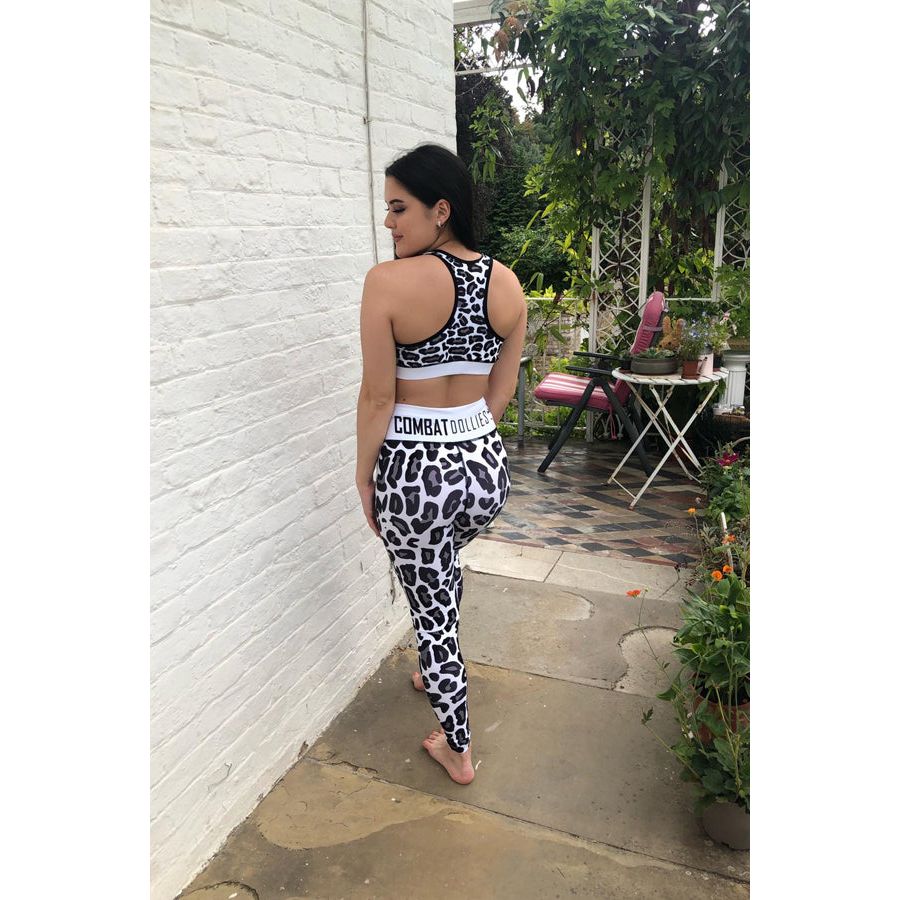 Combat Dollies White Leopard sports bra add some subtle leopard print to your look. Matching legging available.