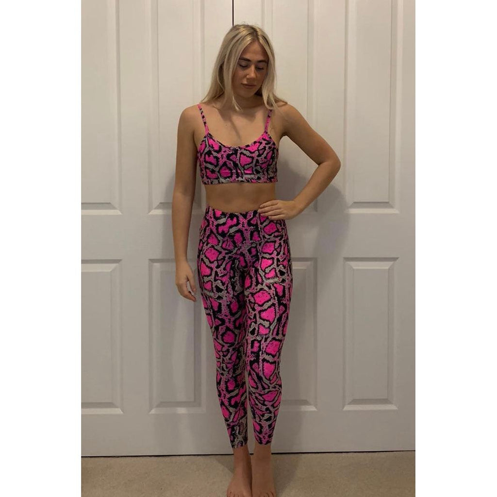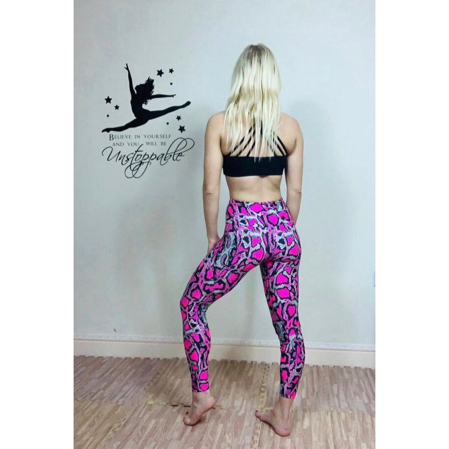 Body sculpting leggings with a gorgeous pink snake print. Our Gisele model is ideal if you have a small waist to hip ratio, and want a squat proof legging.