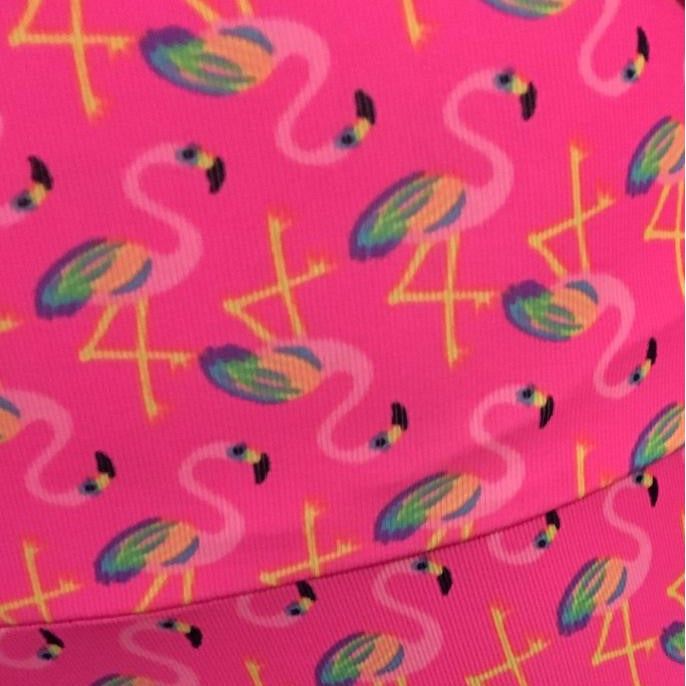 Our gorgeous soft bra is perfect for Yoga, Pilates or medium impact sports. Can also be worn as a swimwear bra top. Made with our supersoft Brazilian supplex fabric in bright pink with a cute flamingo print. Pair with matching