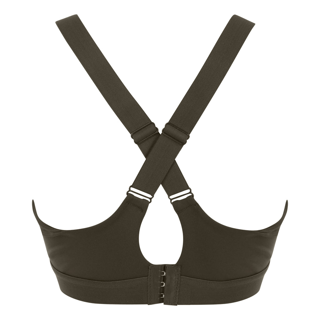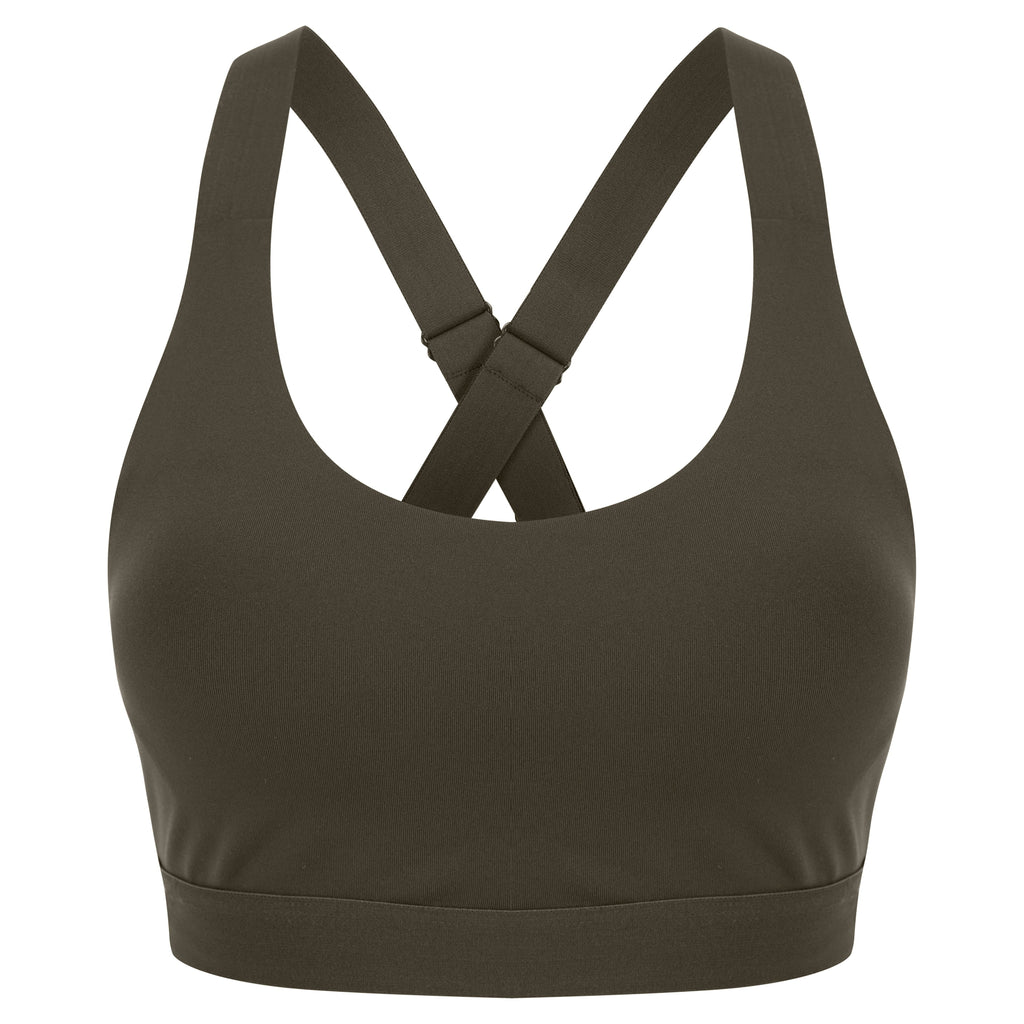 Step n Pump Essentials Khaki Green Core Performance Bra Top. Ideal for medium-impact exercise.. Round neckline.. Our sports bra offers premium support with soft, elasticated straps that hug the body and allow for a custom fit.. It has adjustable clasps