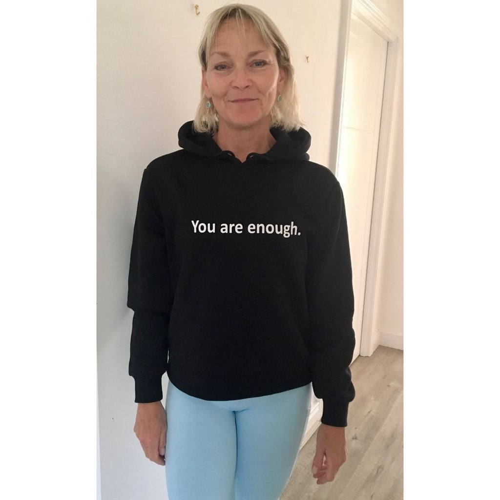 Step n Pump Essentials Luxury Black You Are Enough Hoodie is the ultimate comfortable hoodie which you need in your every day wardrobe.. Presenting a hood with drawstrings and wide rib cuffs on the sleeves and hem. . The comfy oversize
