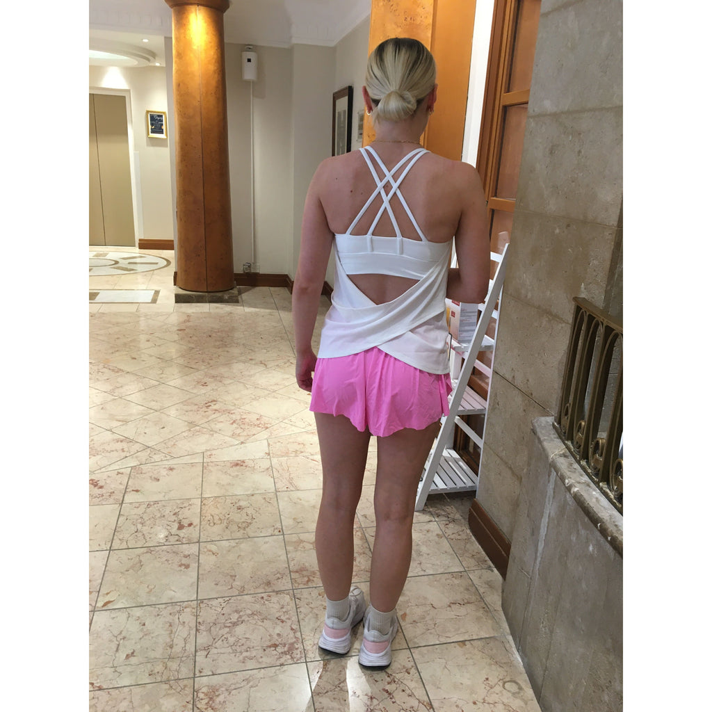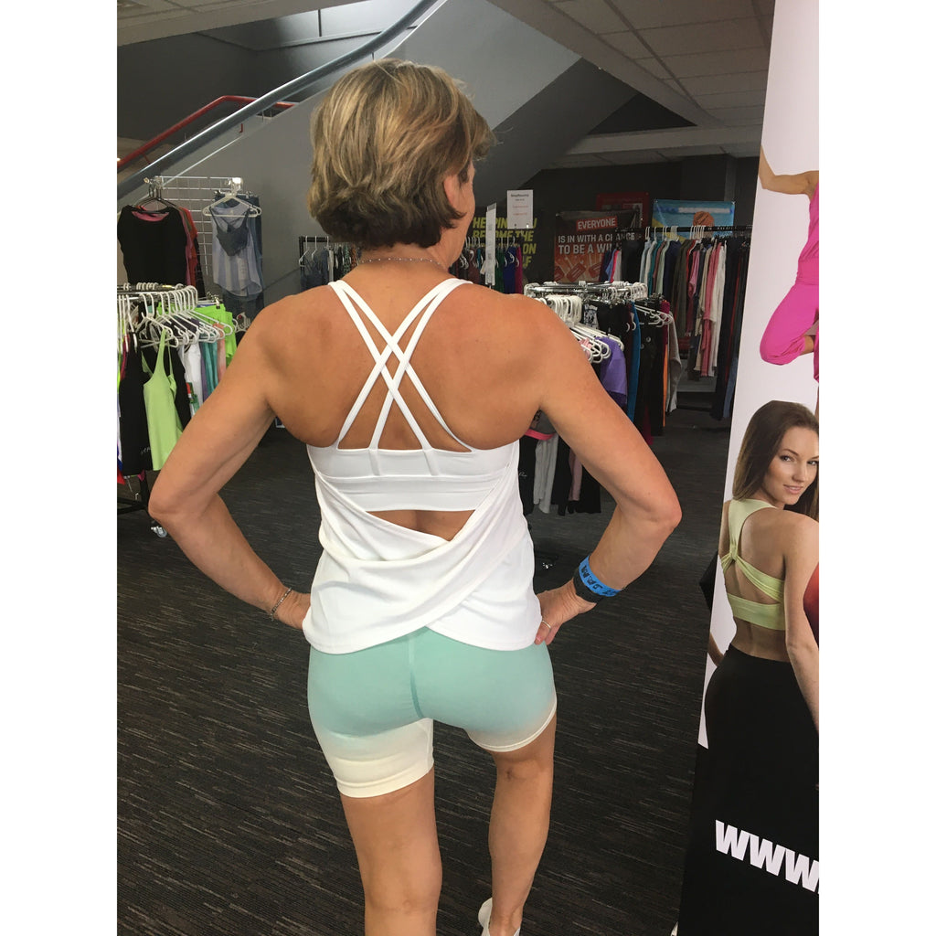 . Exclusively designed . Gorgeous supportive built in bra top with featured criss cross detail . Active 4 way super soft stretch fabric . Sweat wicking . Compression . Superior shaping . Relaxed fit at the bottom . White or