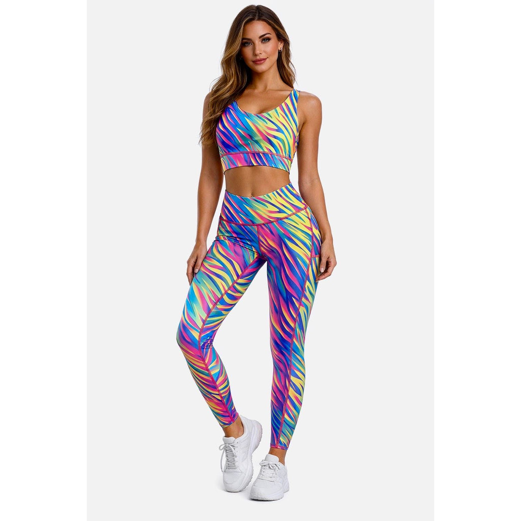 Features:- . Vibrant UV Reactive Neon Flame Print . High Flat Waistband With Internal Adjustable Drawstring . Pocket On The Thigh . Concealed Back Pocket . 4 Way Stretch Wicking fabric . Matching Crop Top, Shorts With Pockets, Loose Running