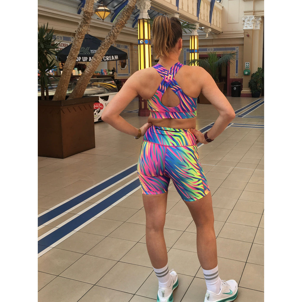 Features:- Vibrant neon Flame print Criss Cross Back Detail Supportive with deep band 4 Way stretch Technical wicking fabric Team up with matching shorts, skort, capri, leggings PRE - ORDER ...