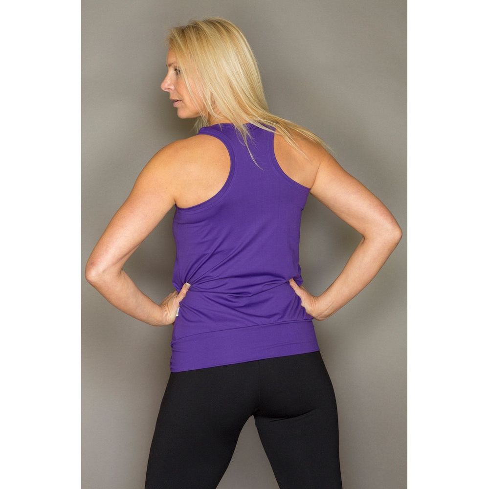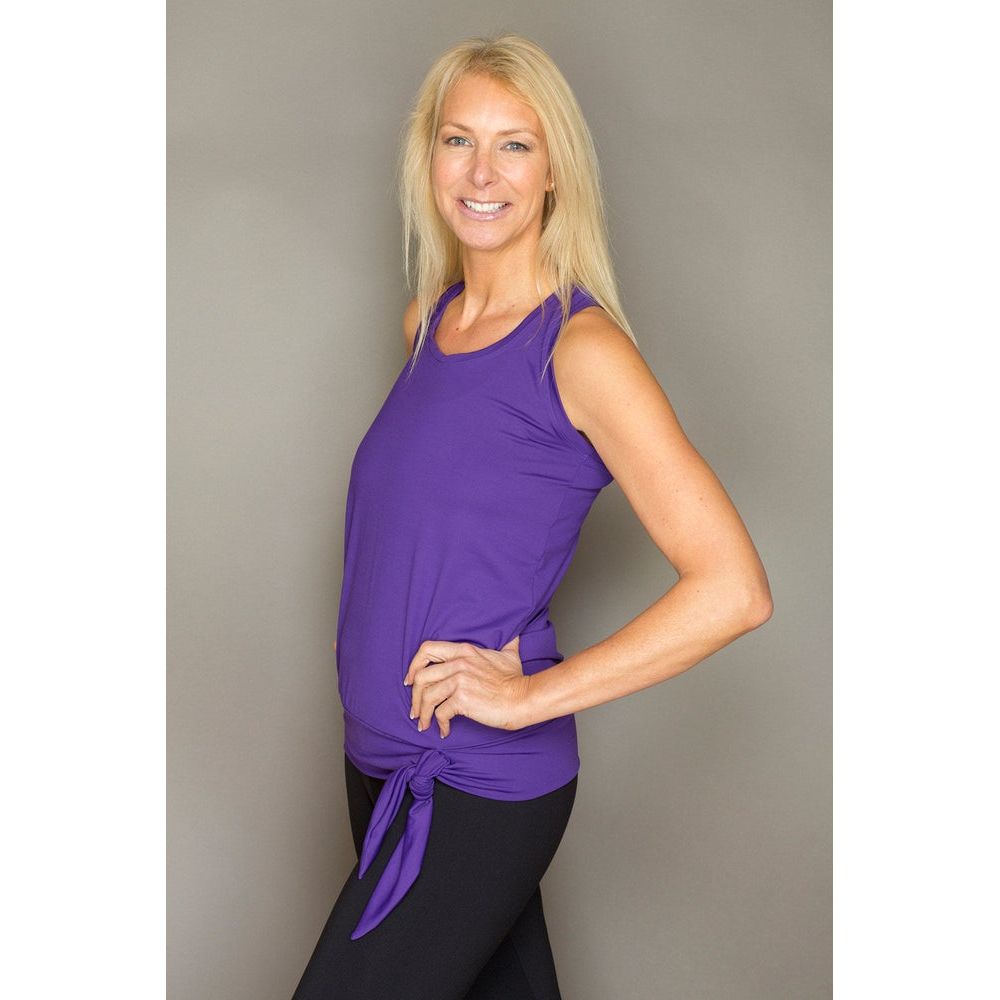 This practical longer vest has a racer back with a built In support. It features a wide band at the hem with a tie which can be adjusted around your hip which is very flattering. The wide band and tie