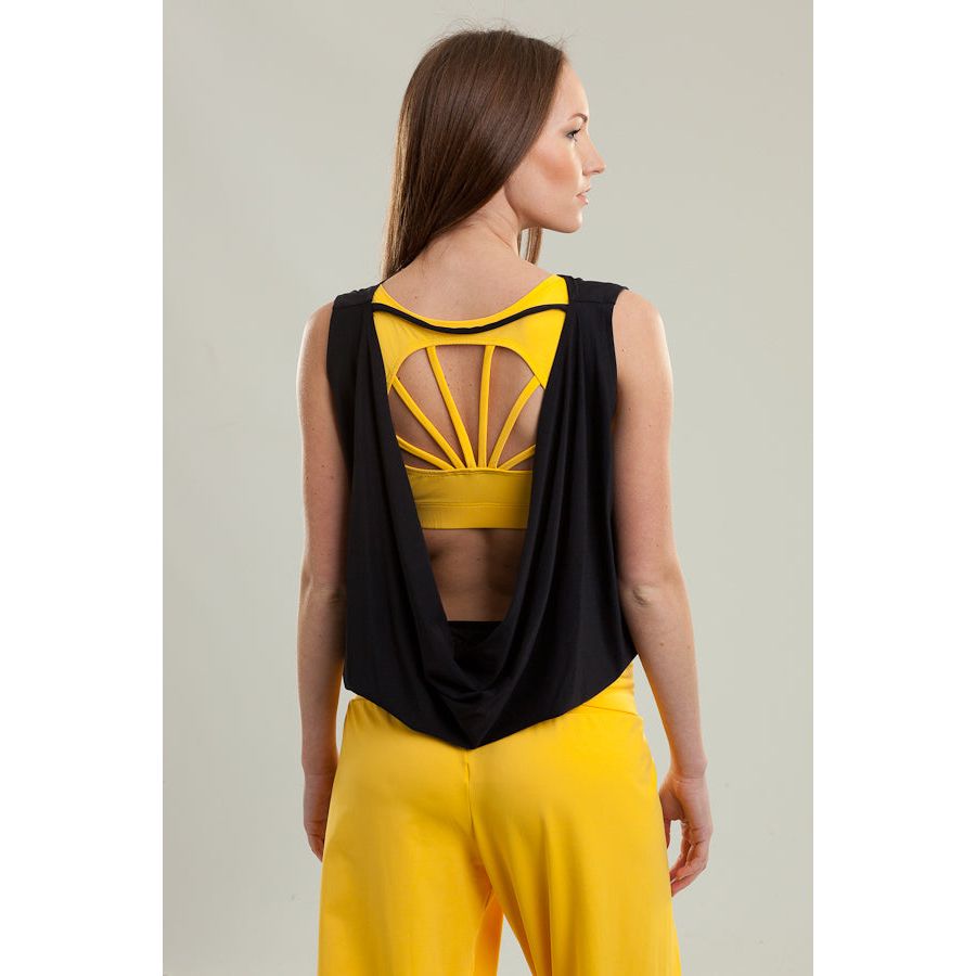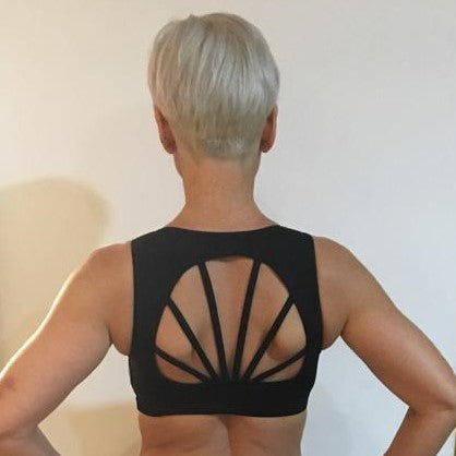 This sexy unusual crop top is very supportive and features a V shape front neck line with strappy fan shape cut out back detail.