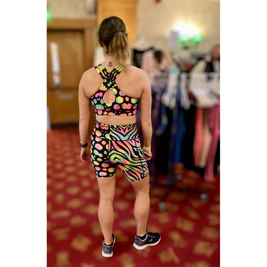 Our beautiful unique wild neon pop print bra top looks amazing with the shorts, capri bottoms or leggings. Features:- . Criss Cross back detail .Very supportive with wide band for extra support . Technical wicking fabric . 4 way stretch