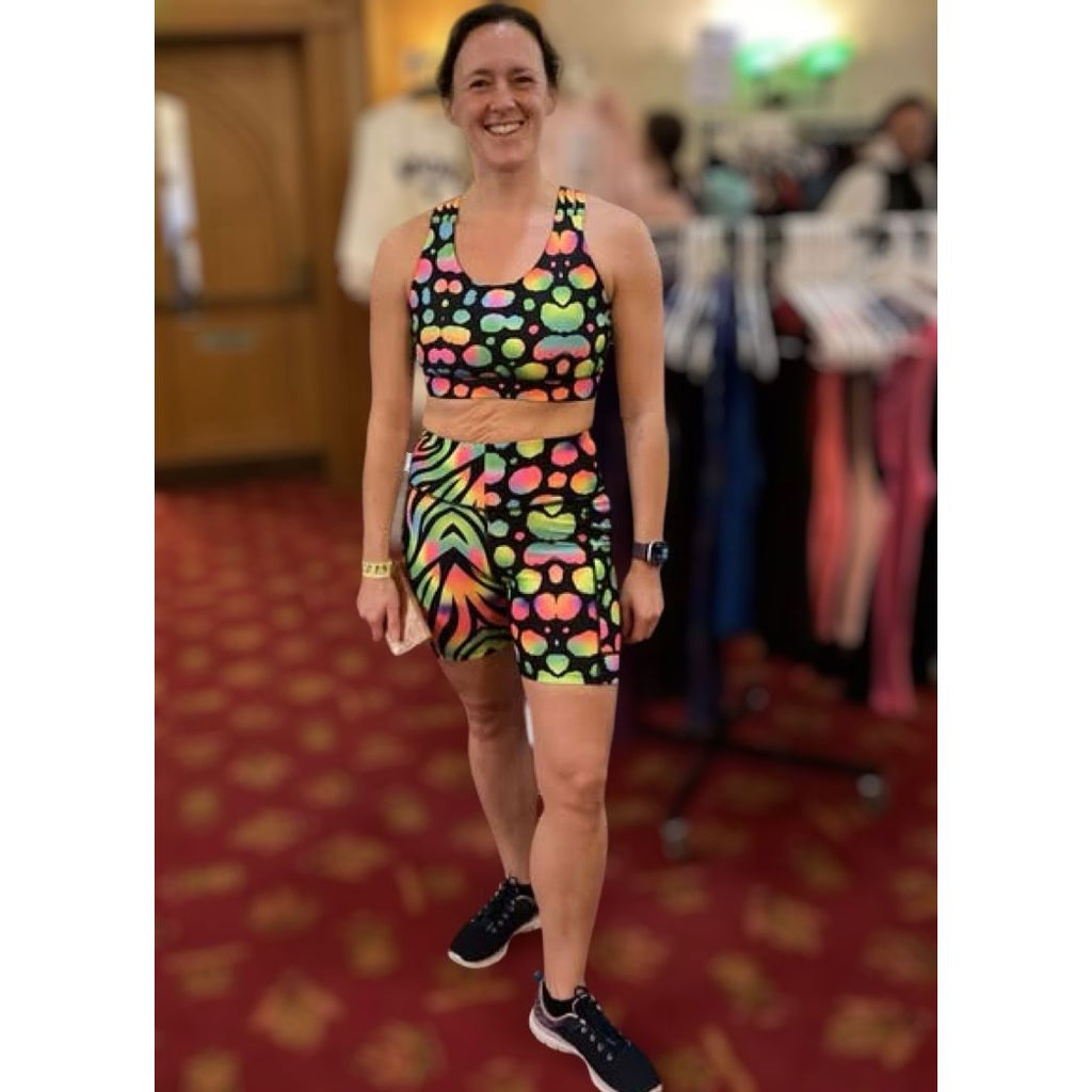 Our beautiful unique wild neon pop print bra top looks amazing with the shorts, capri bottoms or leggings.