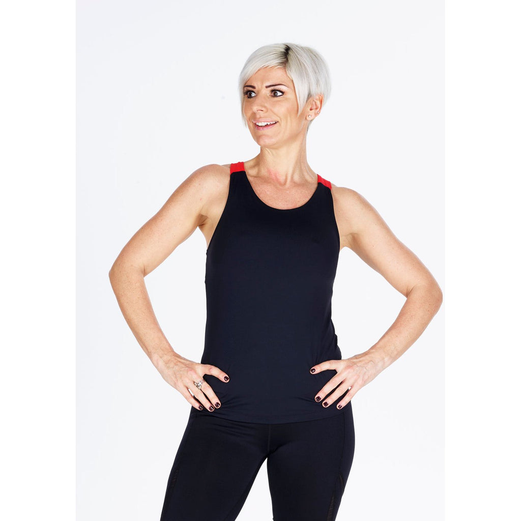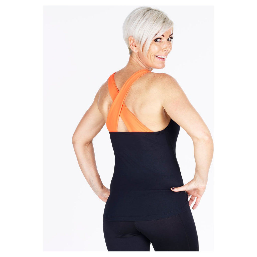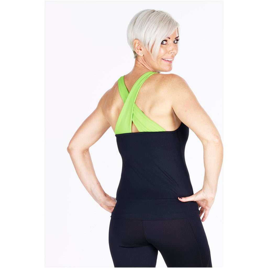 This stunning cross back top is black meryl with contrast colour wide crossover straps at the back.